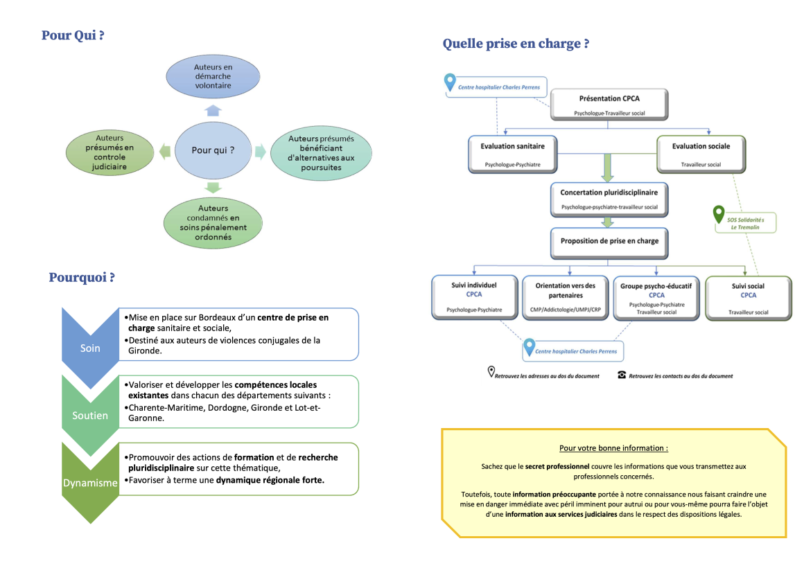 Le Centre de Prise en Charge des Auteurs de Violences (CPCA), basé à l’hôpital Charles Perrens à Bordeaux, propose un accompagnement spécialisé aux personnes ayant exercé des violences, notamment conjugales.